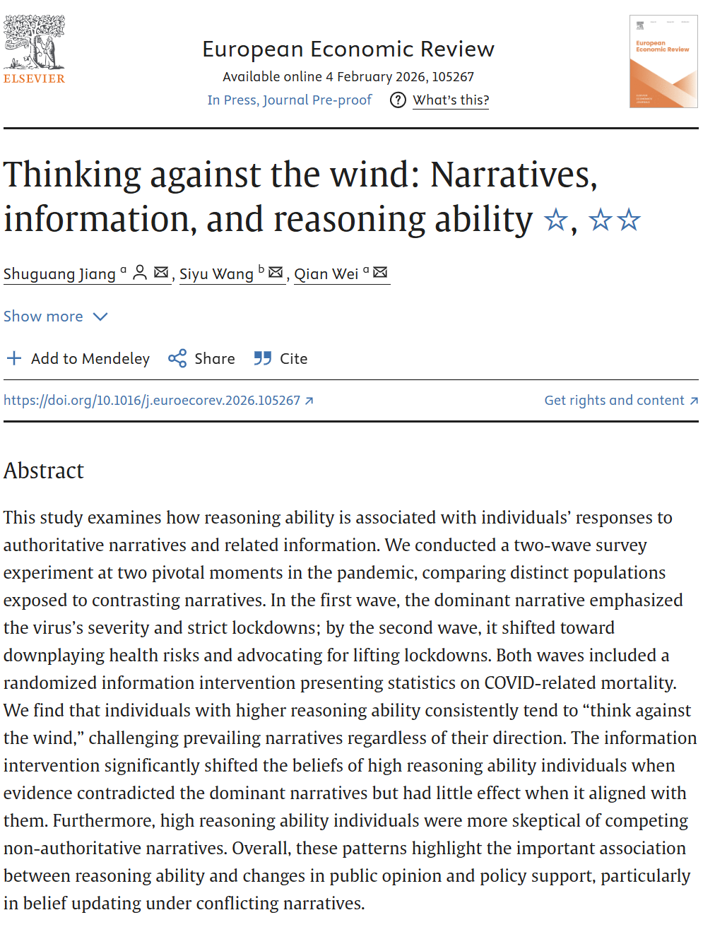 这项研究探讨了逻辑推理能力如何影响个体对官方叙事及相关信息的反应。研究者在利用新冠疫情政策转型独特自然实验条件,在两个关键时期进行了两次调查实验,对比了不同推理能力差异的个体在不同舆论环境下的信念差异。结果显示,高推理能力者表现出明显的“逆风思考”倾向:在官方强调病毒危害和封控必要性时,他们更倾向于反对封控;而当官方转而淡化病毒威胁时,他们反而表现出更高的警惕性。此外,事实信息干预能显著改变高推理能力者的观点,但前提是该信息必须与其面对的权威叙事相冲突。研究还发现,这类人群对非官方的竞争性论述同样持有更强的怀疑态度。总体而言,该研究揭示了推理能力在应对社会危机和处理复杂信息时,对公众舆论和政策支持度产生的系统性影响。