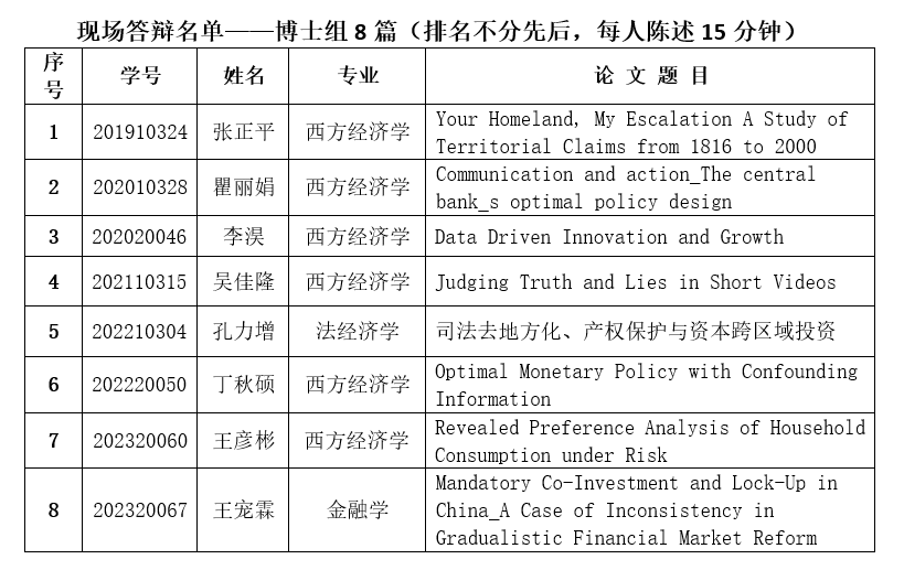 每年开展一次研究生经济学学术论文比赛征文。今年于2025年2月开始征文,经过初选打分及老师评议,共有12篇论文入围论文答辩会。现定于2026年1月4日(周日)下午2点,在知新楼C座201教室进行一、二等奖论文答辩。请各位入围者准备好答辩PPT(博士组每人陈述15分钟,硕士组每人陈述10分钟)以及15份纸质版答辩论文,按照以下博士组、硕士组的分组顺序依次答辩。