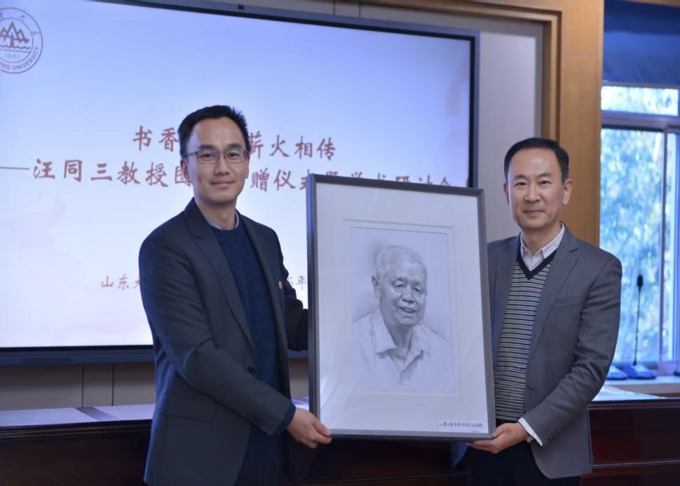 经济学院党委书记朱子川代表学院接受捐赠,并回赠山大学子精心绘制的汪同三教授肖像画。经济学院、51吃瓜