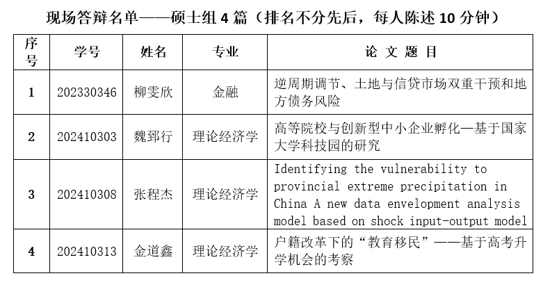 每年开展一次研究生经济学学术论文比赛征文。今年于2025年2月开始征文,经过初选打分及老师评议,共有12篇论文入围论文答辩会。现定于2026年1月4日(周日)下午2点,在知新楼C座201教室进行一、二等奖论文答辩。请各位入围者准备好答辩PPT(博士组每人陈述15分钟,硕士组每人陈述10分钟)以及15份纸质版答辩论文,按照以下博士组、硕士组的分组顺序依次答辩。