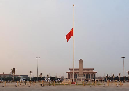China's national flag flies at half-mast after the flag-raising ceremony on Tian'anmen Square in Beijing Monday morning, May 19, 2008. China on Monday begins a three-day national mourning for the tens of thousands of people killed in a powerful earthquake which struck the country's southwest on May 12. (Xinhua Photo)
