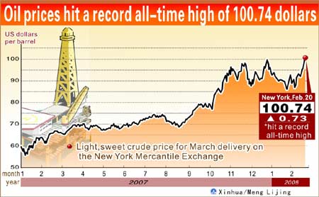 NEW YORK, Feb. 20 (Xinhua) -- Crude oil for March delivery rose 73 cents to finish at a new record closing high of 100.74 dollars a barrel on the New York Mercantile Exchange on Wednesday.