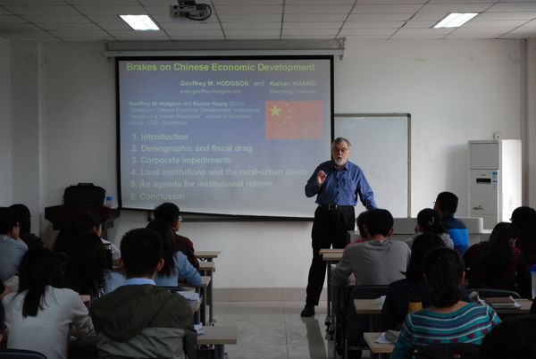 4月14日,Hodgson教授最后一场讲座的主题为“Brakes on Chinese Economic Development”。首先,Hodgson教授展示了中国自1950年至2010年的GDP增长数据,并指出前人对于中国经济的研究并未充分考虑制度和经济结构问题。然后,Hodgson教授分析了中国的人口结构带来的人口红利和财政障碍问题。进一步地,Hodgson教授研究比较了中国的国有企业、外资企业、中外合资企业和民营企业在发展中的困境,并指出后三者在中国发展受到的主要限制来自于中国的经济体制、国家政策。最后,Hodgson教授指出,中国经济快速增长的主要原因在于国家的方针导向。